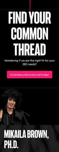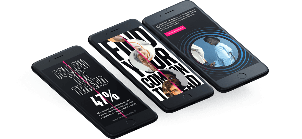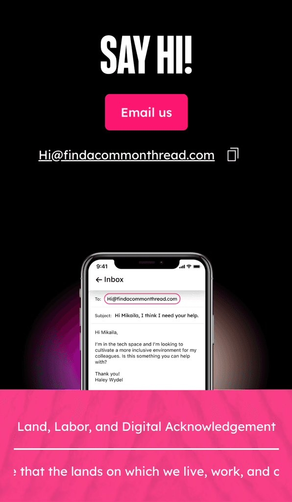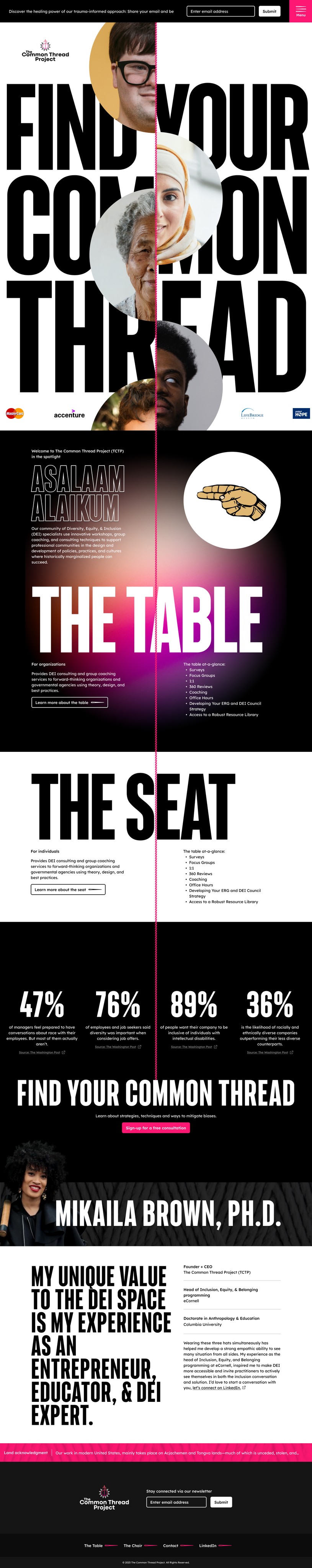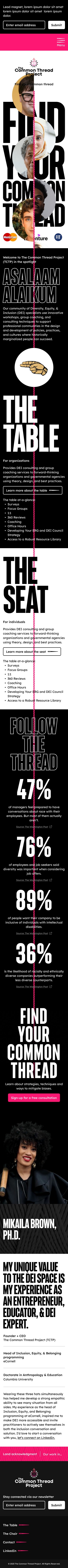 The 'Find Your Common Thread' concept explores pairing individuals in brief moments of connection, showcasing both their commonalities and individualism. The thread visually guides users to the primary CTA: scheduling a discovery call with Mikaila.